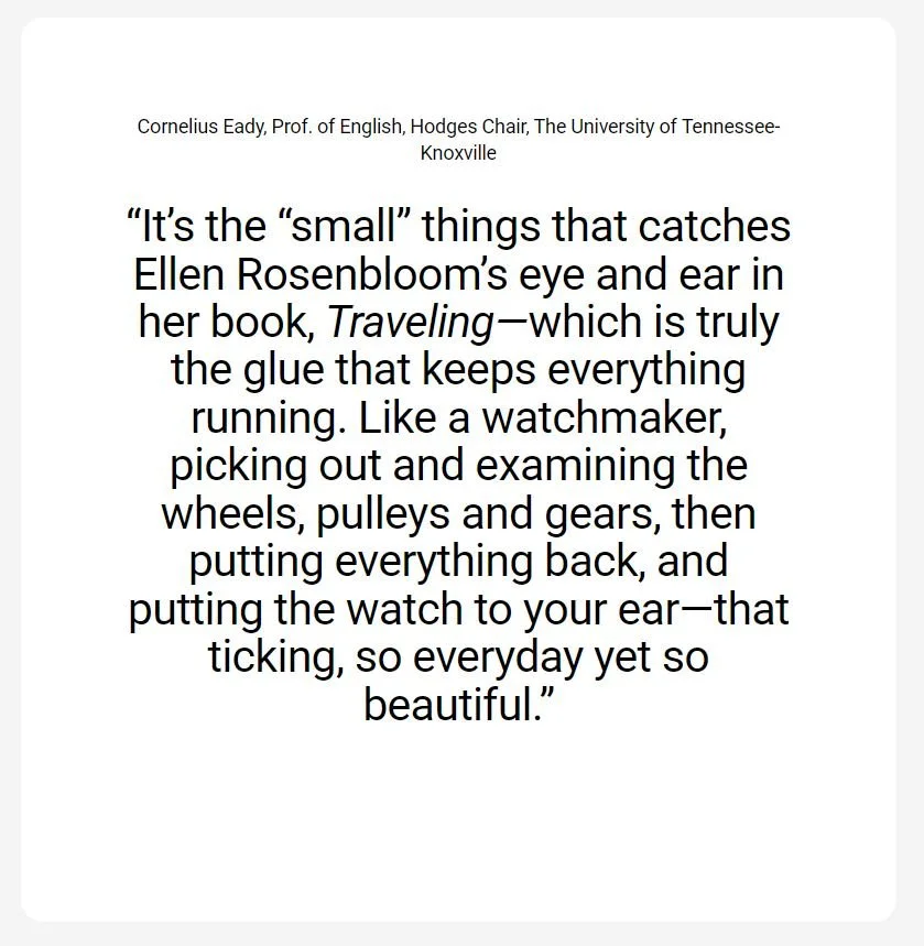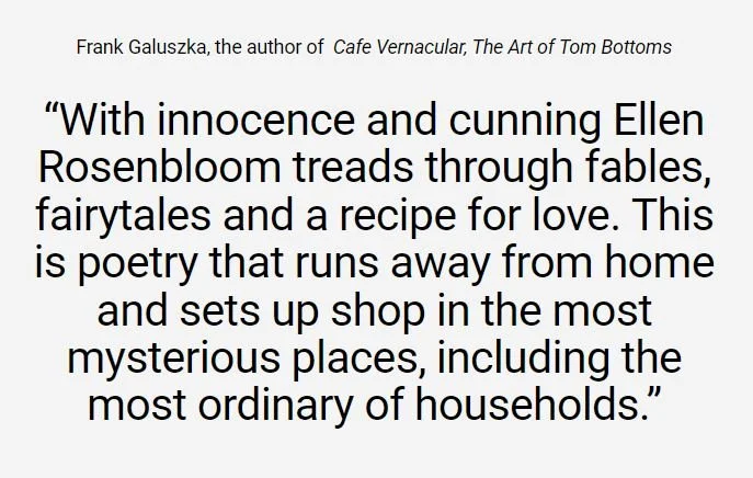 Published by Bottlecap Press, 2024Contact me for a copy. ellenrosenbloompoetry@ellenrosenbloompoetry.com Published by Finishing Line Press, 2025Buy at Finishing Line PressBuy at Amazon More to Come